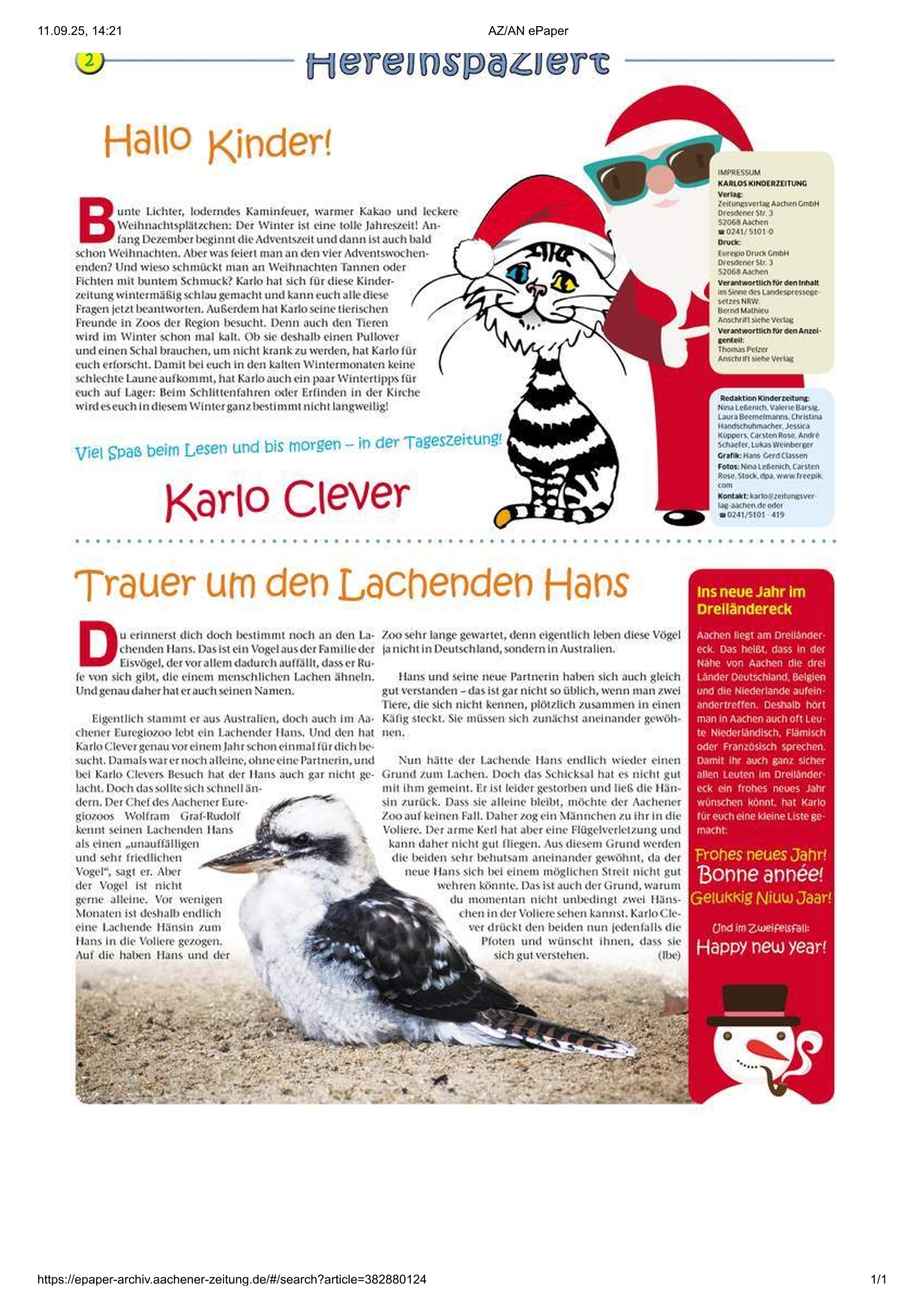 Kategorien Verschiedenes Zeitungsarchiv 2017 Spaß im Winter bei den Tieren Beitragsautor Von Herbert Sliwinski Veröffentlichungsdatum 03.07.2023 2016 Zurück zum Archiv… 2018 Teile Du diesen Beitrag als Erste(r)!